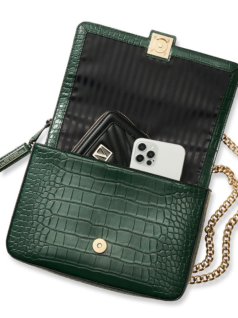 Estructurado y elegante, un estilo para llevar de dos maneras. La correa de cadena tipo joyería cambia del hombro al modo bandolera con facilidad. En elegante cocodrilo esmeralda, ideal para fiestas, con nuestros característicos herrajes con el monograma en V.